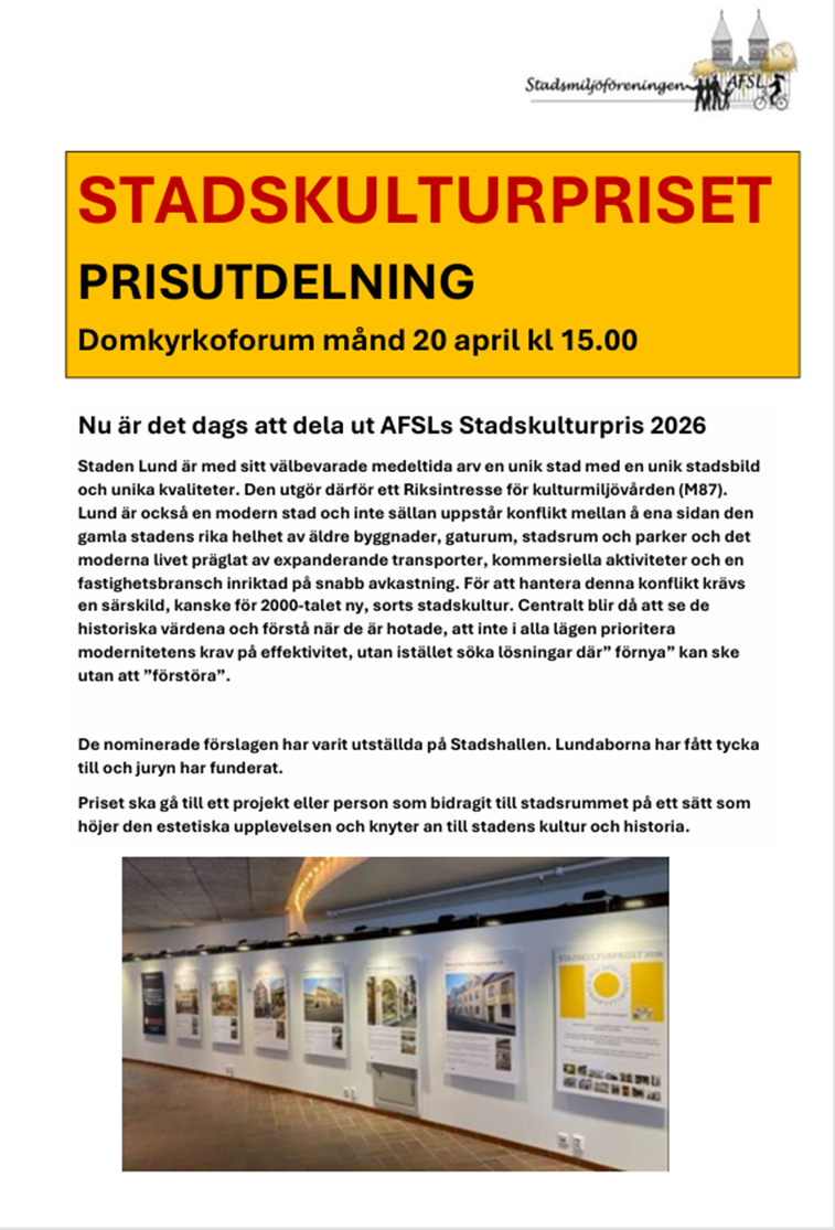 Nu är det dags att dela ut AFSLs Stadskulturpris 2026.