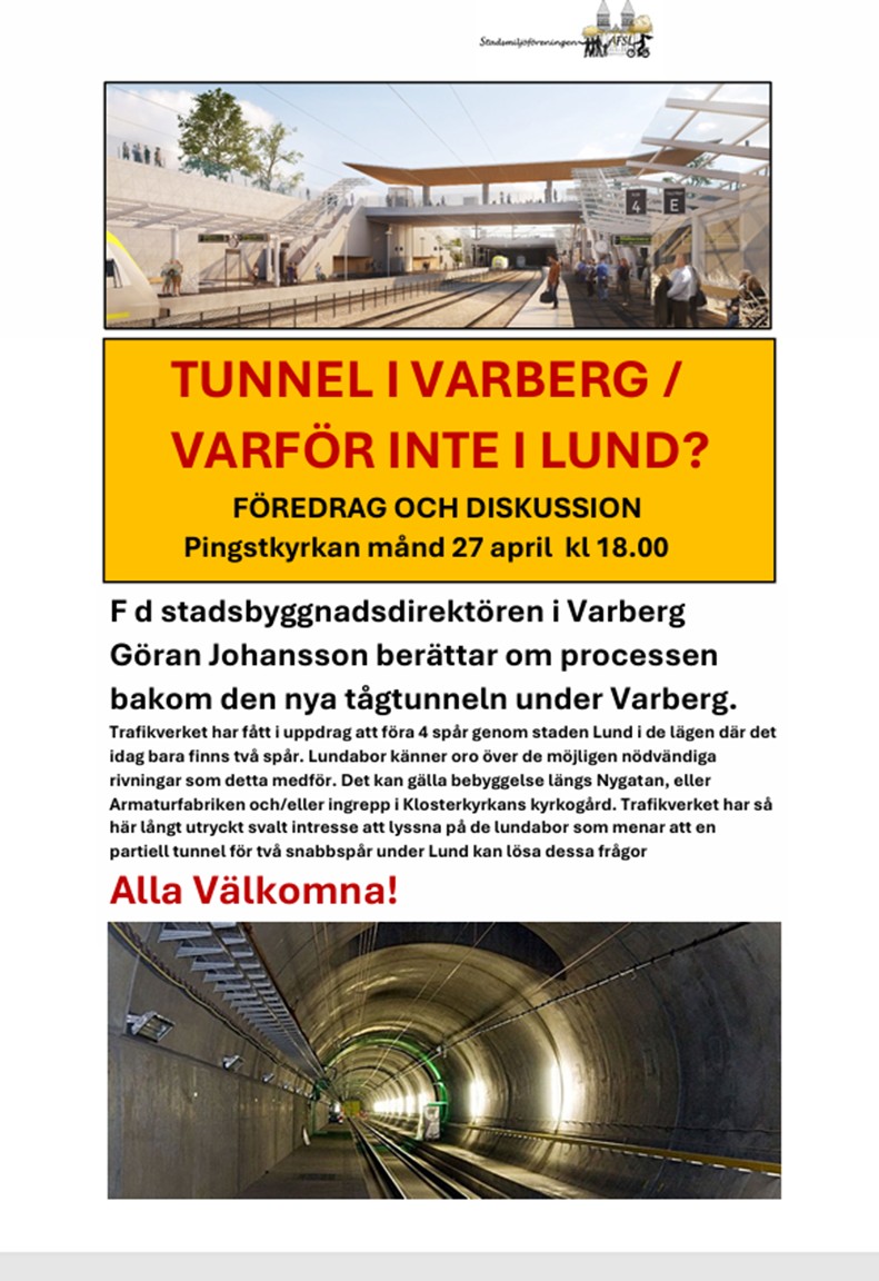 TUNNEL I VARBERG / VARFÖR INTE I LUND? Föredrag och diskussion. Pingstkyrkan månd 27 april kl 18.00. Alla välkomna!